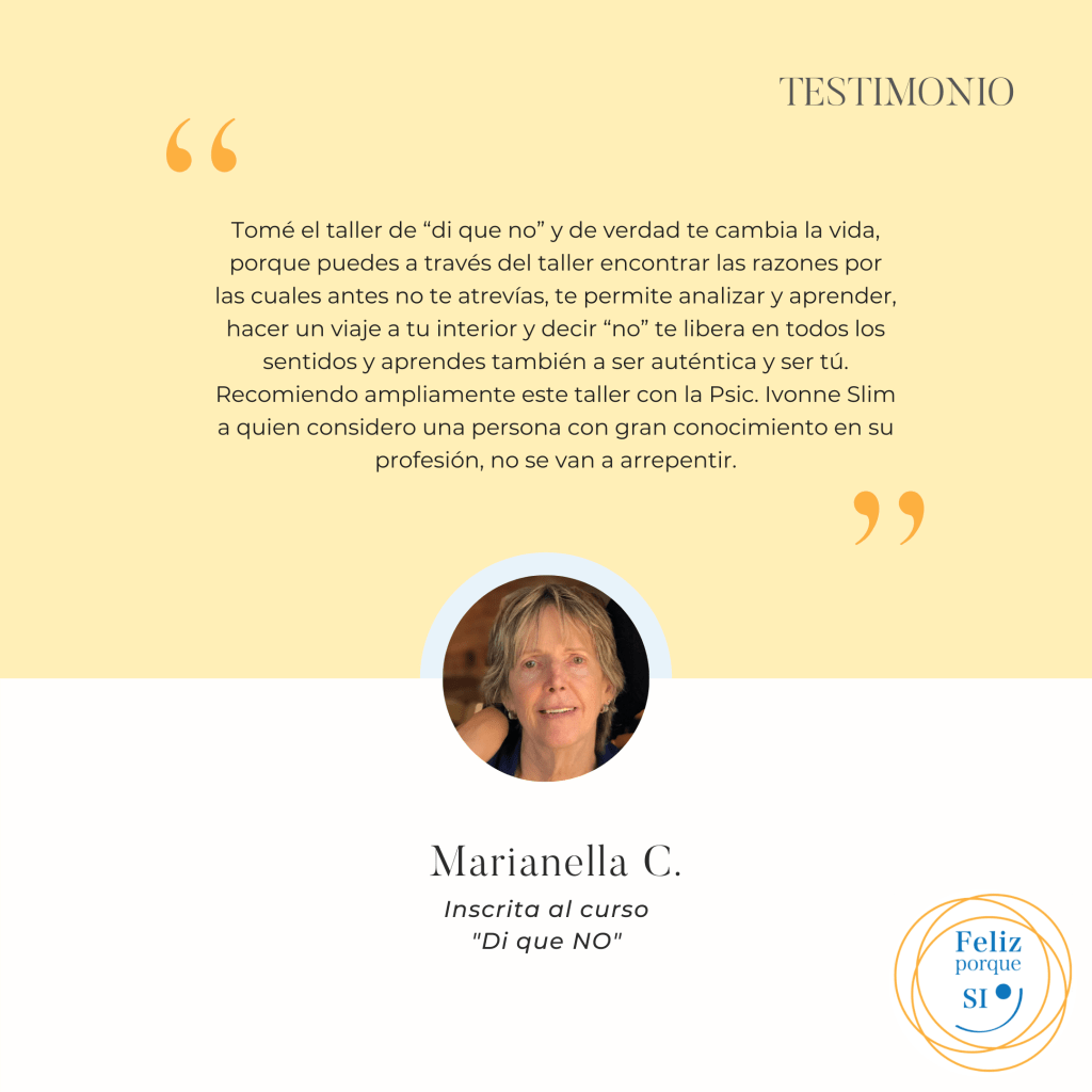Este curso te permite conectar con el poder que tienes para decir que NO, y que dejes de una vez por todas de acceder a hacer cosas que no quieres. Es un curso electrónico, con lecturas, videos y hojas de trabajo, y la inversión es de solamente $200
